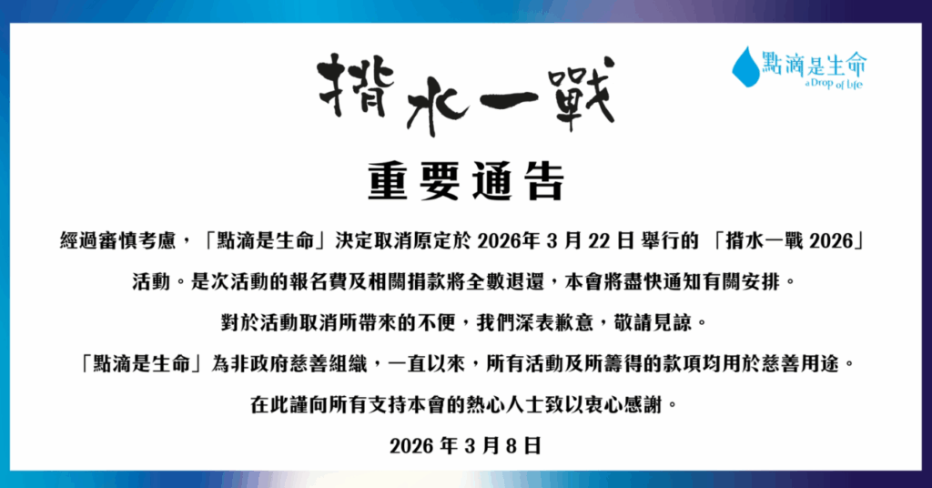 揹水一戰2026突然取消 | 網傳主辦「點滴是生命」涉邪教活動 未公布取消原因