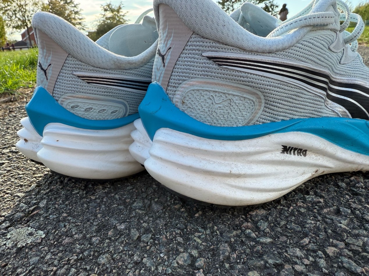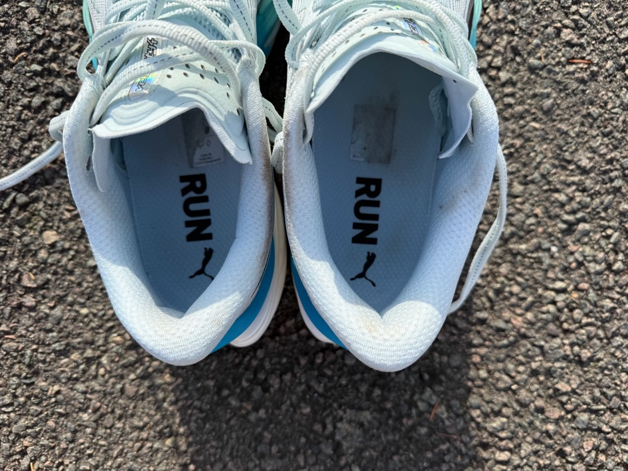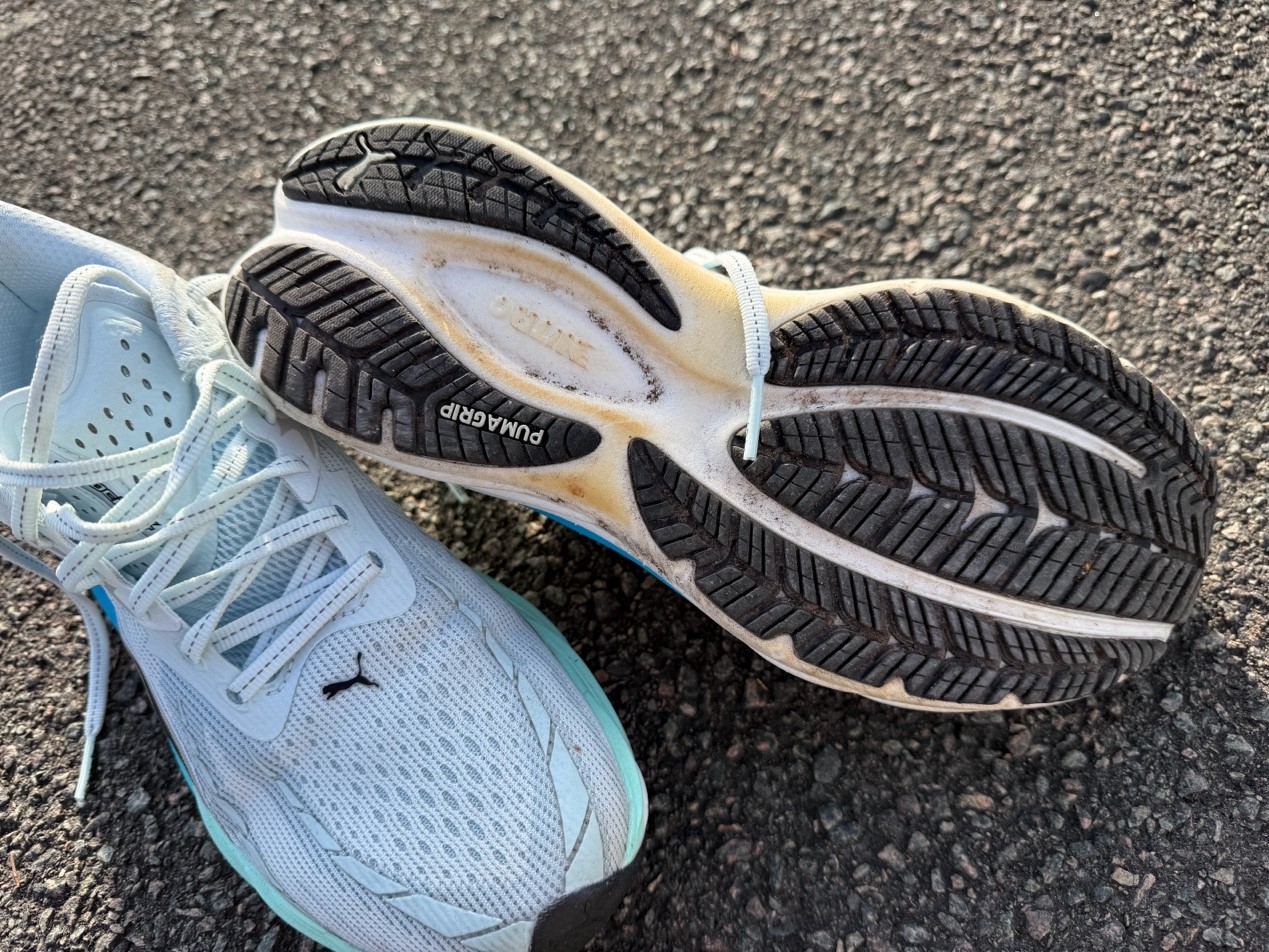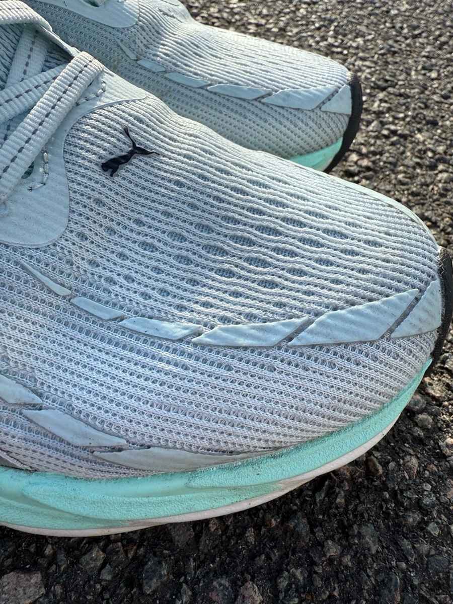 Pumagrip 橡膠外底一向黏性高、抓地力強且耐用,適合公路、人行道,甚至輕度碎石或泥濘路段。反而若能適度減少橡膠覆蓋面積,或許能進一步降低重量,讓整體更具競速感。