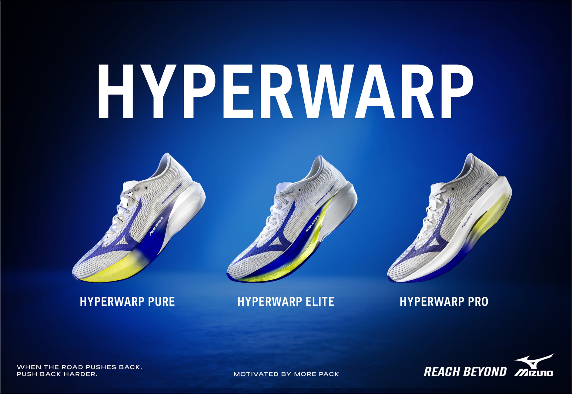 HYPERWARP 全系列在視覺上採用統一的灰白鞋身配搭藍黃色中底設計。技術層面上,三款型號均搭載高回彈特性的 MIZUNO ENERZY XP 中底,旨在提供高效的能量回饋與柔軟腳感。