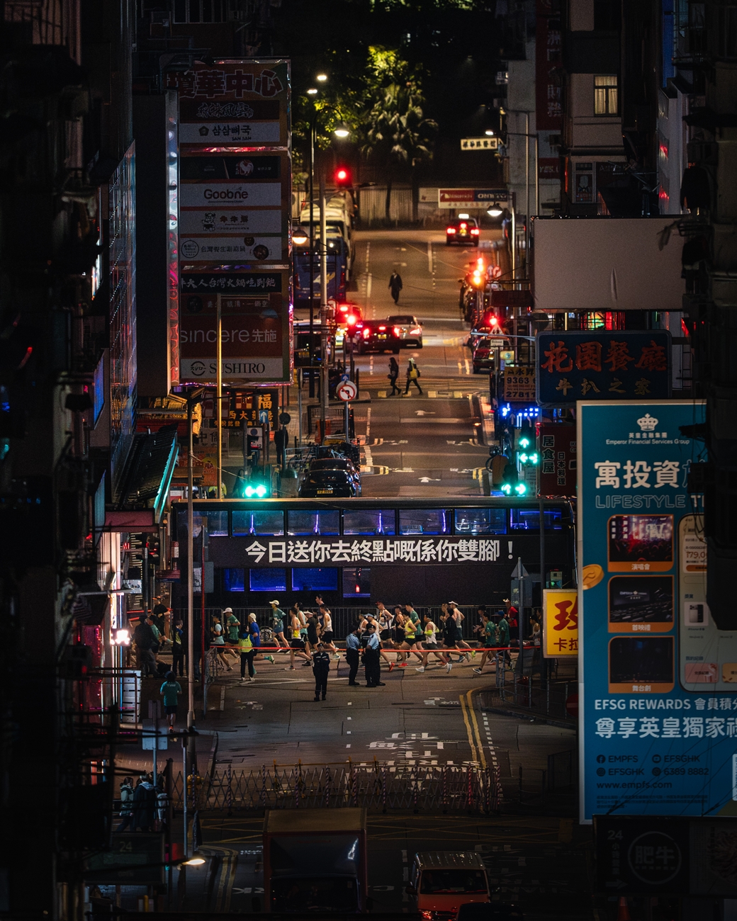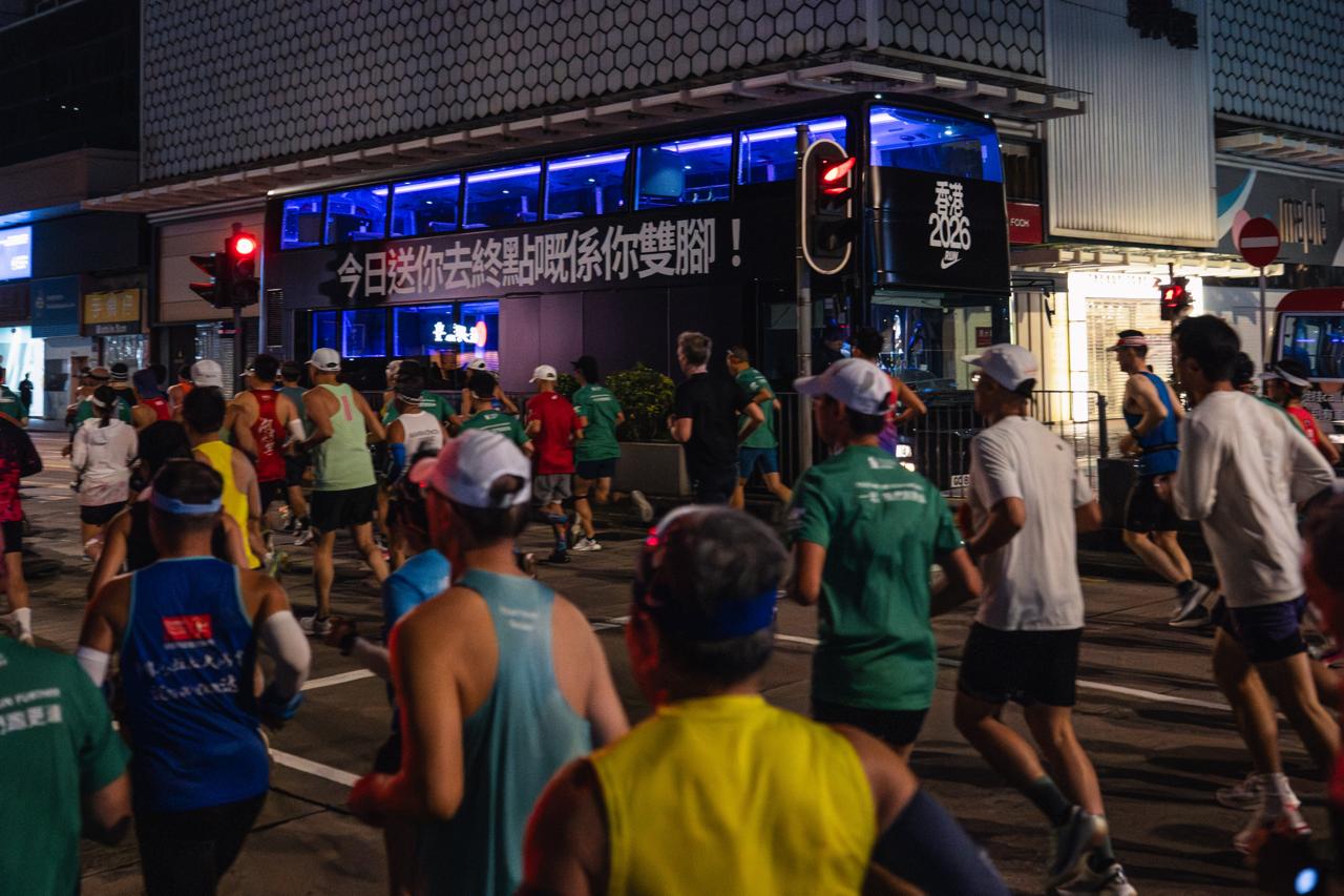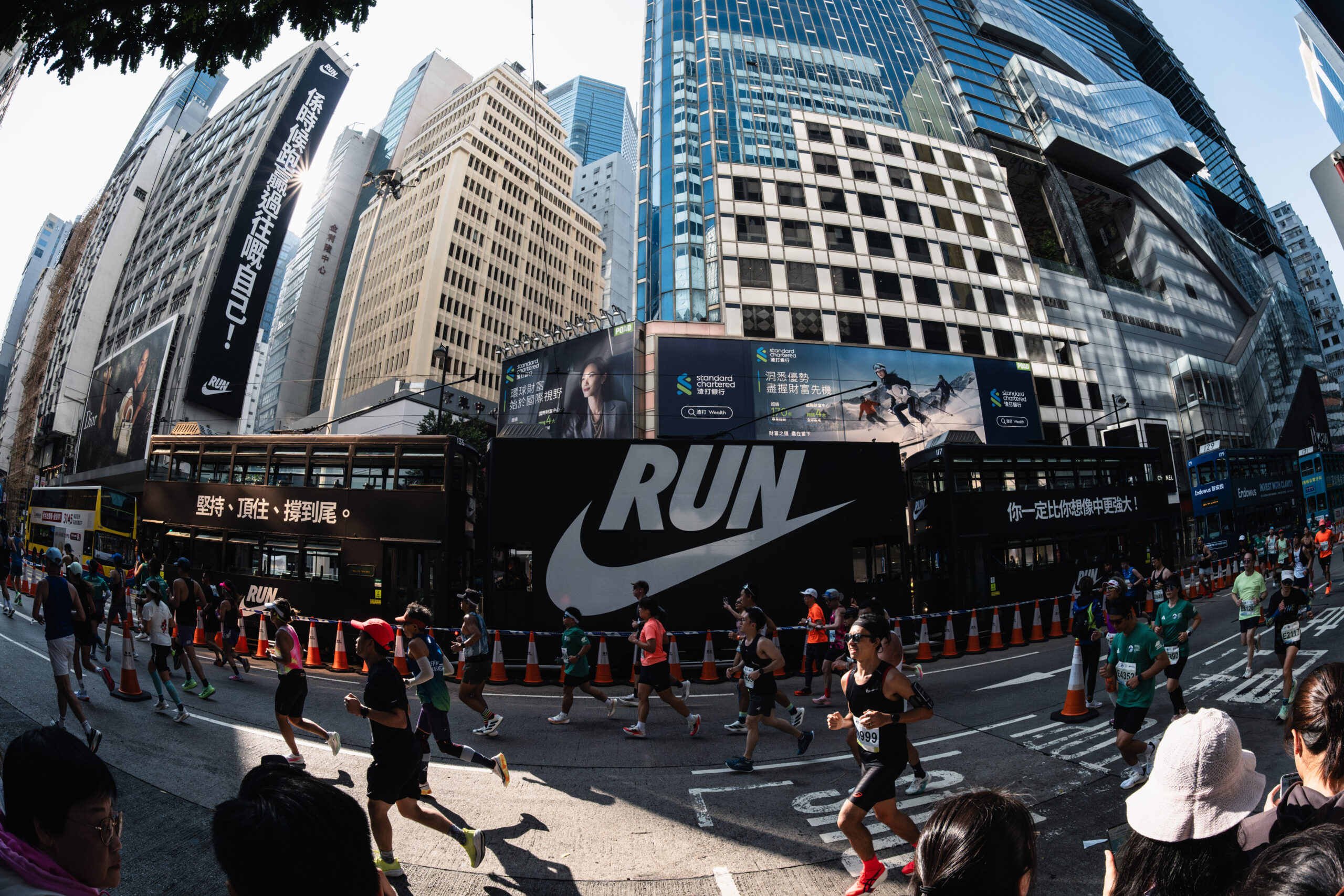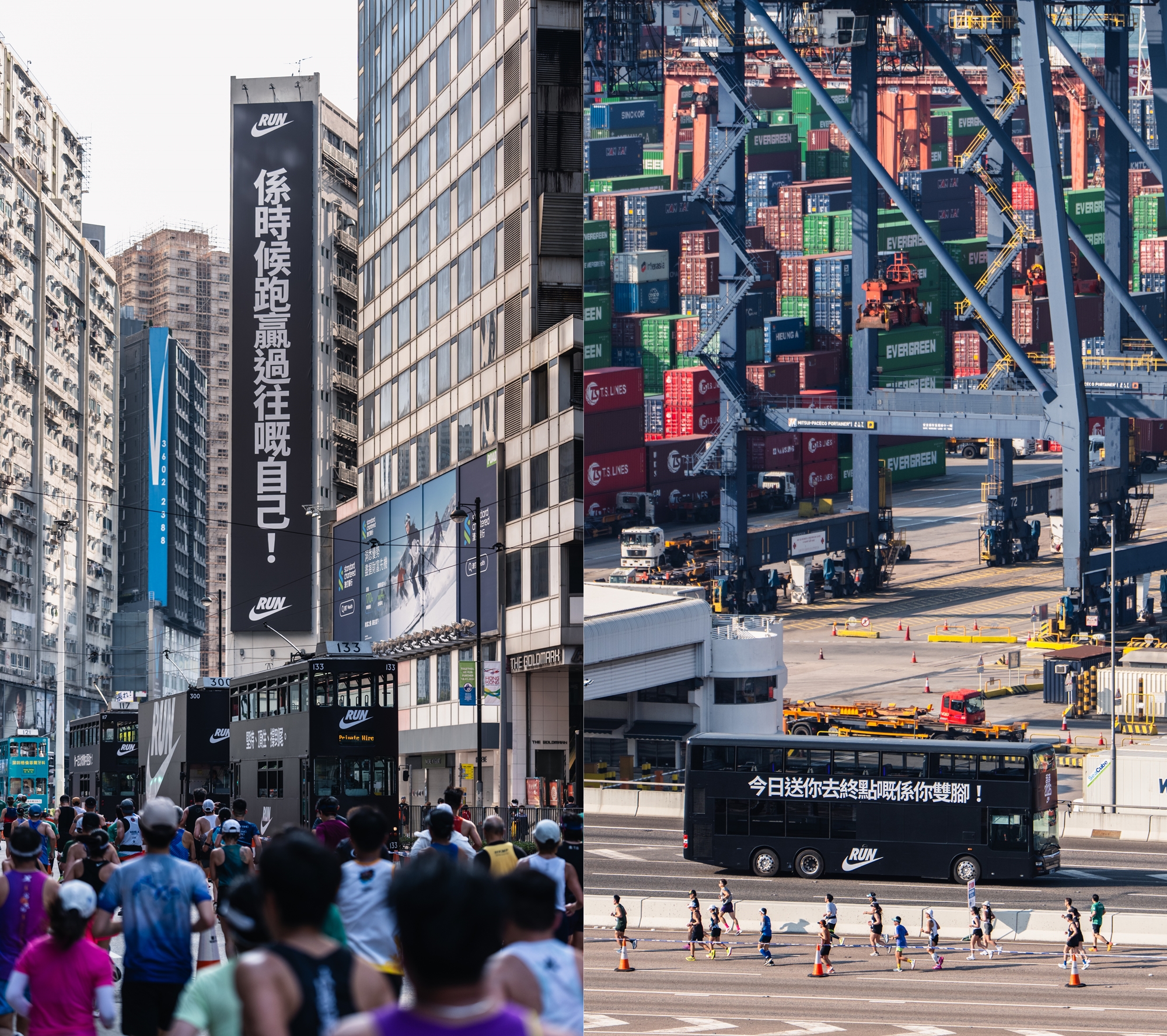 走到關鍵地點,Nike的打氣字句也更有力量——在英光大廈外牆的「係時候跑贏過往嘅自己!」鼓勵跑手突破自己過去的界限。短短一句「今日送你去終點嘅係你雙腳!」讓雙腿再痛的跑手也願意踏出最後一步;「跑盡佢,今日嘅巴士只係陪襯!」,即使疲憊也要用意志征服每一步。