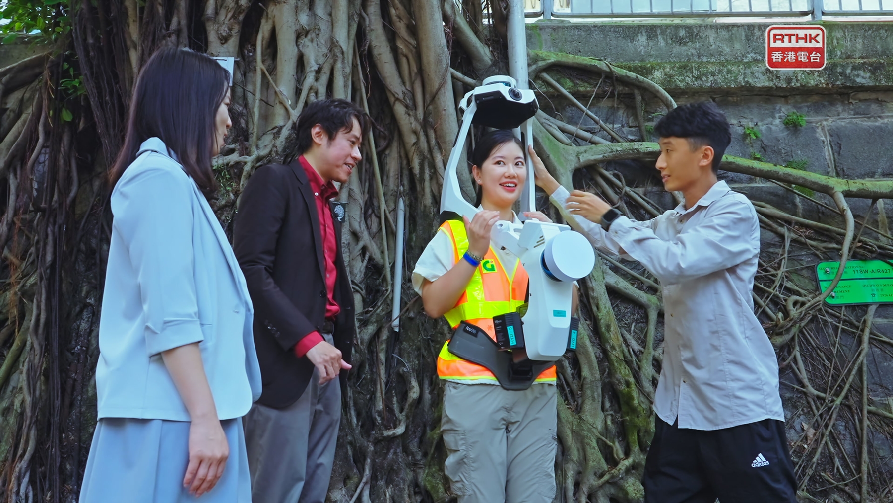 主持人親身體驗「背包式移動測距系統」,收集石牆榕樹的型態與周邊環境數據作護養分析。
