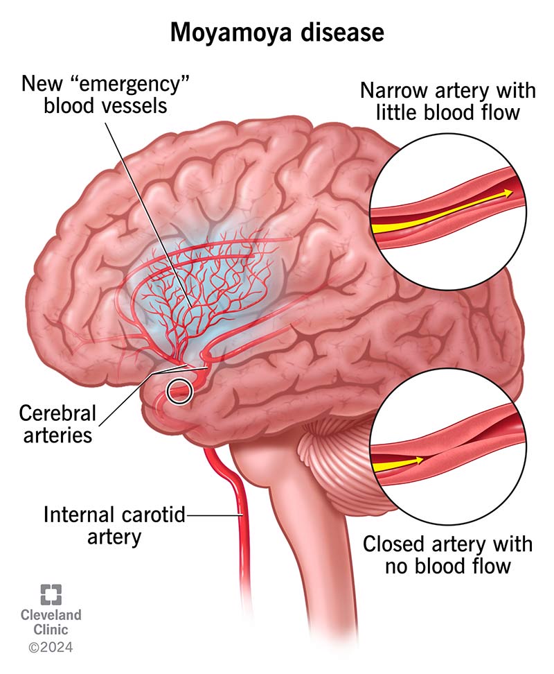該疾病可導致腦部血流不足,引發短暫性腦缺血發作 (TIA)、缺血性中風,或因脆弱血管破裂造成出血性中風。兒童患者多以缺血性中風為主要表現,成人則較常出現腦出血。