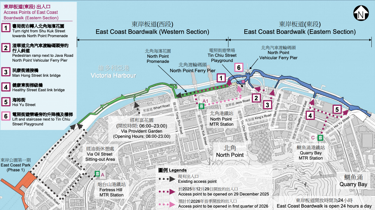 政府宣佈,全長約 2.2 公里的北角東岸板道,其餘下的「東段」路段將於12月29日早上 6 時起正式開放。這「最後一公里」的開通,標誌著由西環堅尼地城至筲箕灣、全長約 13 公里的港島海濱長廊正式全面貫通,實現了多年來「海濱接通」的發展願景。.