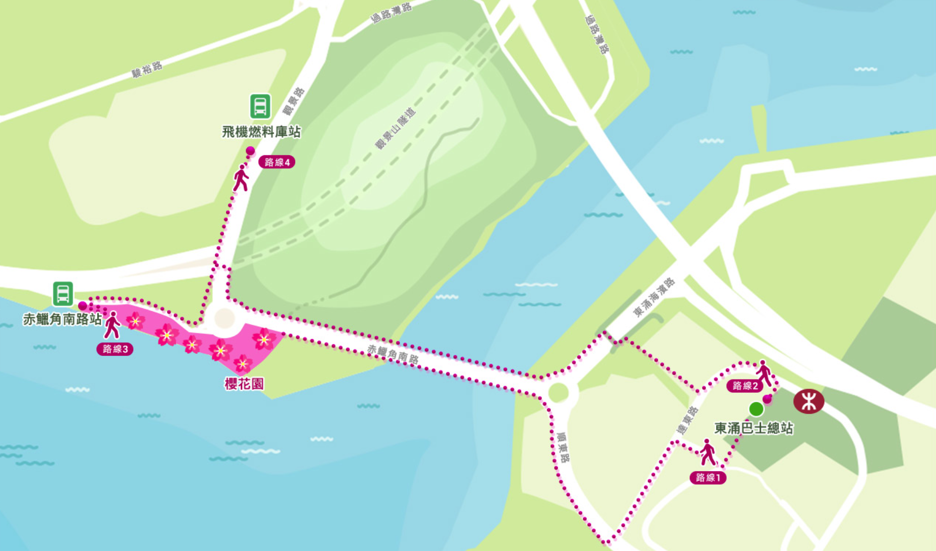 機管局今年特別優化了交通配套。除了現有的「S」及「E」線巴士路線外,園方今年特別開闢了一段全新的行人通道,直接連接東涌港鐵站與櫻花園。