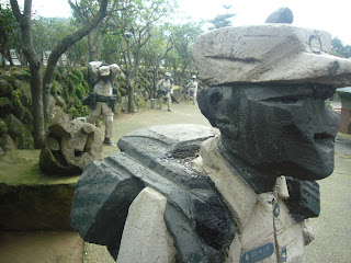 這是朱銘美術館最吸引人的地方,走著走著,人也彷彿置身其中,與雕塑們,和整個環境融為一體;朱銘把整個園區都設計得很開放,沒有任何不淮拍照不淮觸摸的規 定,很有自由的氣氛;也於是鼓勵遊人,將從整個環境人感受到的,融合自己的創意,自由的發揮出來。我們沒有在地上畫畫,不過,就不斷地配合雕塑和自己的感 興,擺出相應的pose照相;未來到這美術館,還不知自己在肢體動作上的創意,原來也不錯呢!
