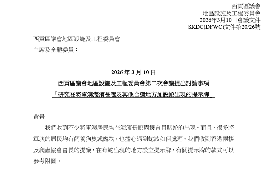 將軍澳海濱長廊屢現蛇蹤 | 14區議員聯署促設「蛇出沒」警示牌