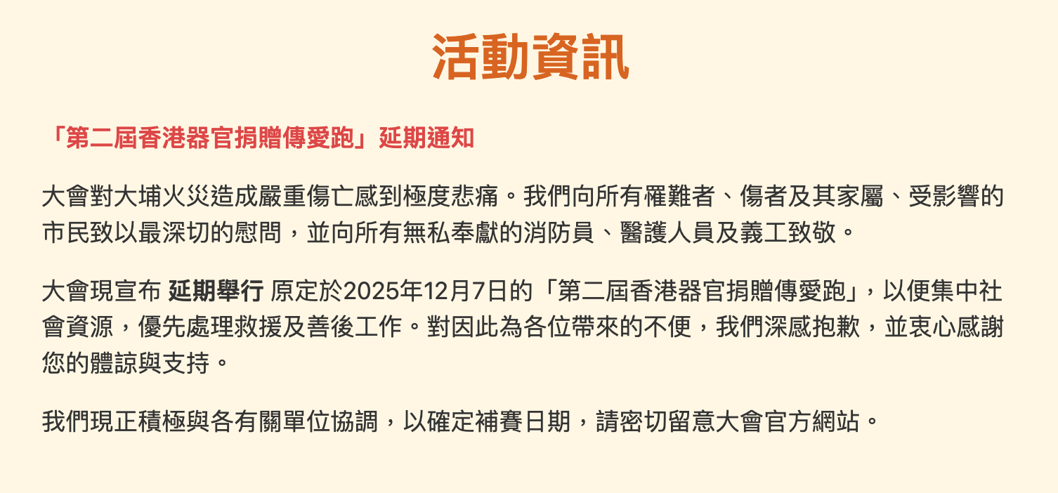 因應大埔宏福苑火災,多項活動或賽事先後宣佈取消或延期。