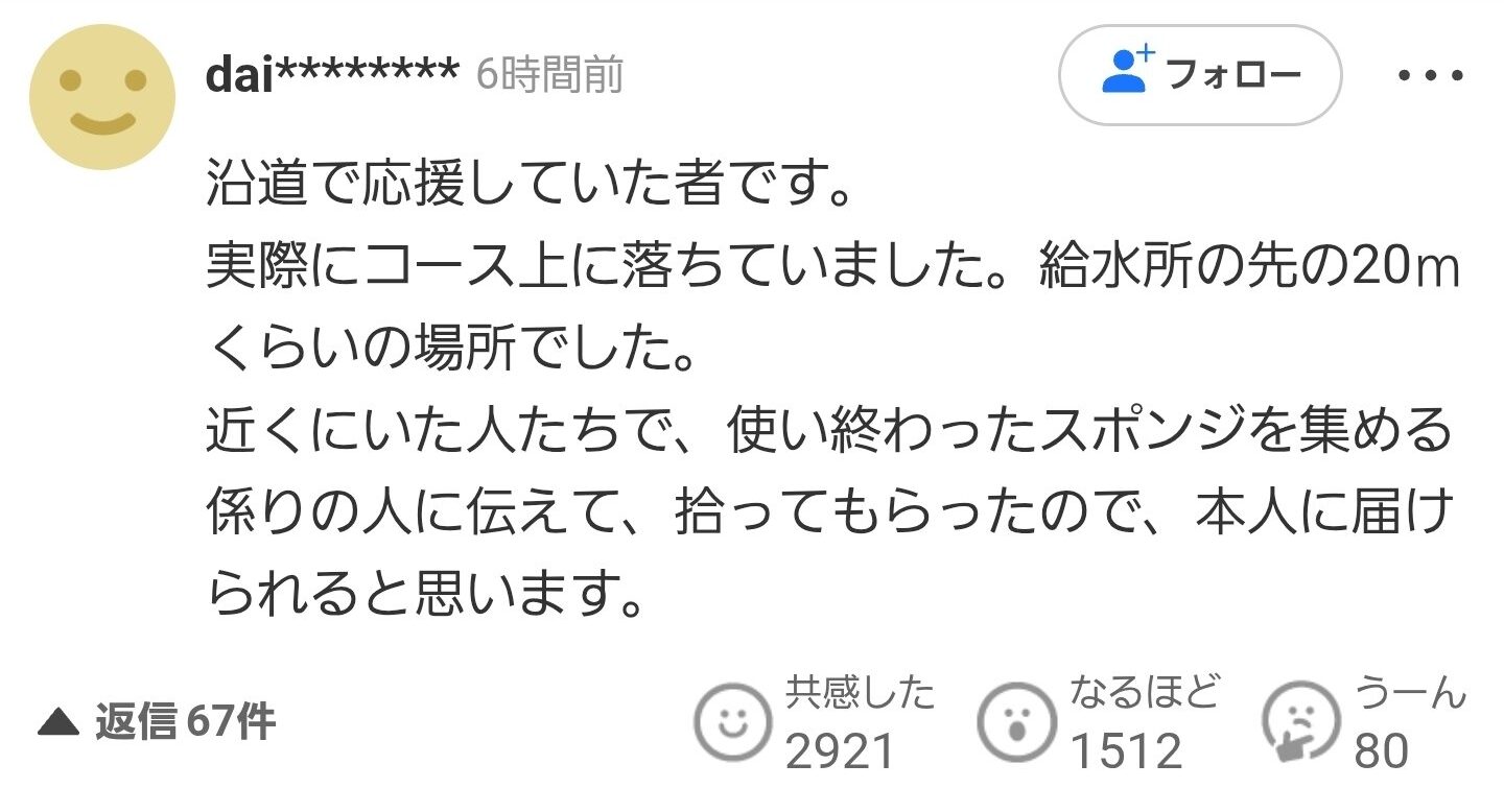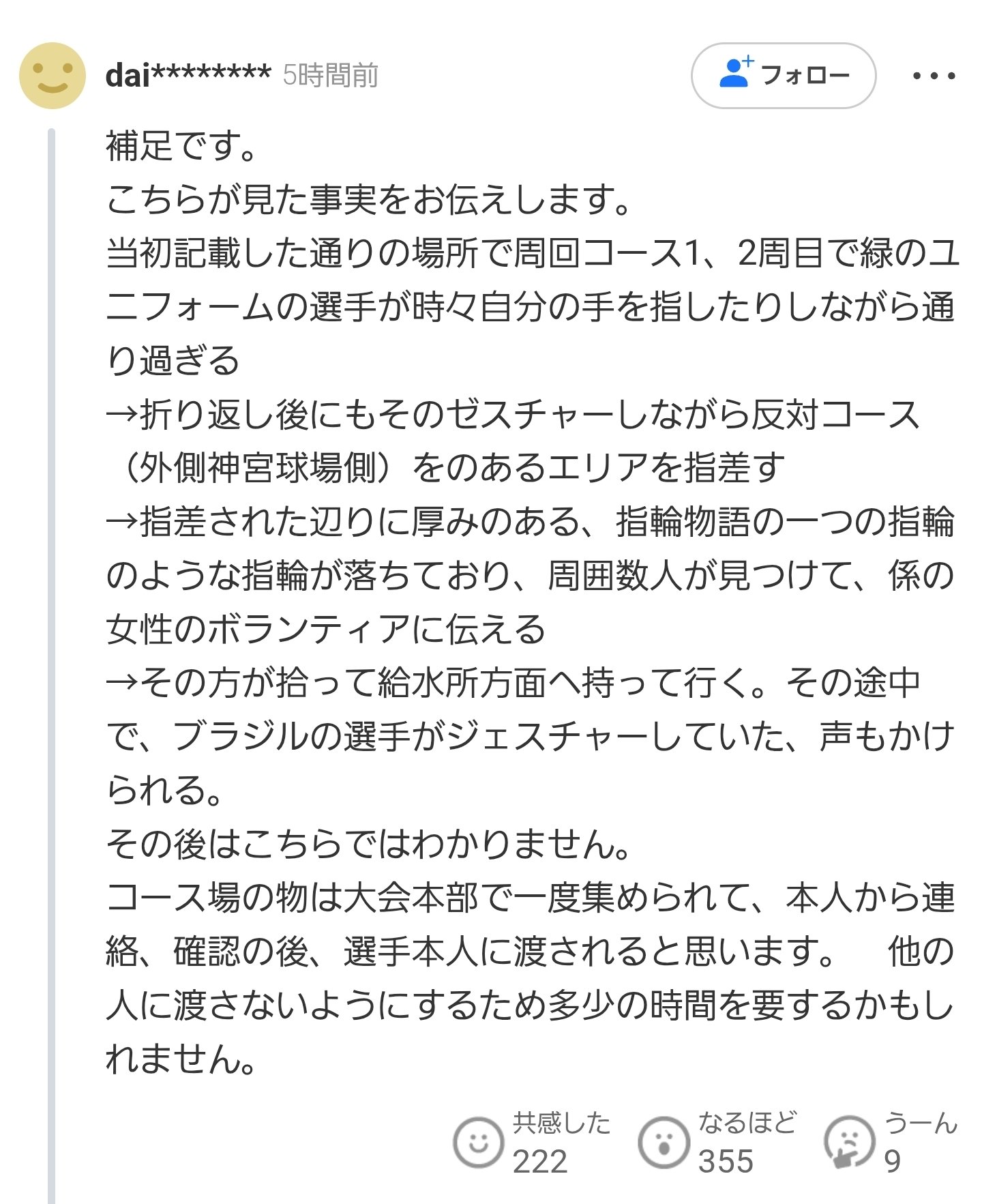賽後,Bonfim公開呼籲協助尋找遺失的婚戒。多名日本選手沿賽道搜索約一小時,最終有一名日本民眾拾獲戒指,並從電視報導中了解事件後主動聯絡巴西隊。