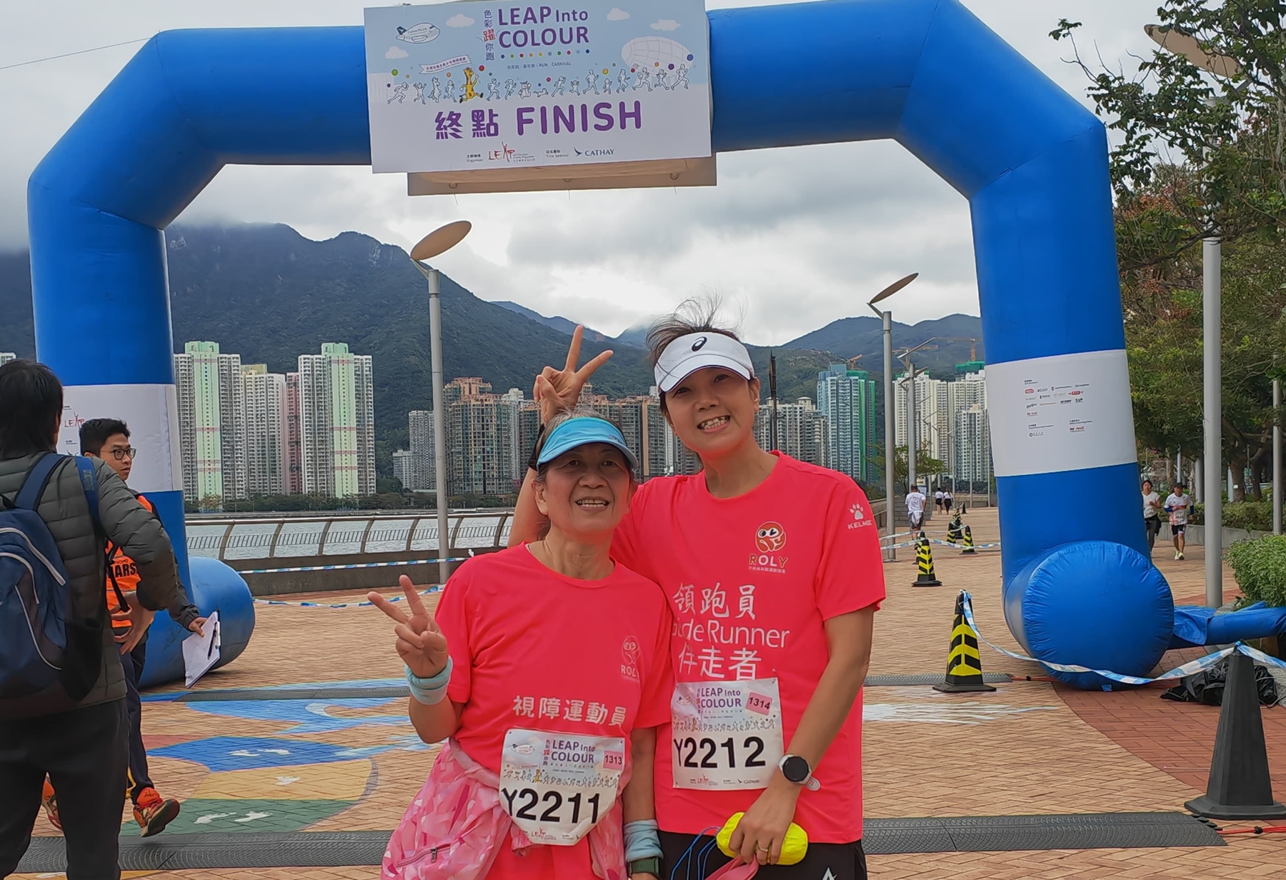 後來,她到香港盲人輔導會學習日常生活技能,認識了一群同路人,也在那裡第一次聽到「有義工帶住你跑步」這個概念。她於是跟著朋友踏入運動場,認識了視障跑手 Gary。第一次,她只敢在場內慢慢步行;在 Gary 的鼓勵下,她由走變跑,由 1 公里到 3 公里,第一次完賽那一刻,她用「原來我真係做得到」形容那份驚喜。再經過系統訓練,10 公里也成了可達成的距離。
