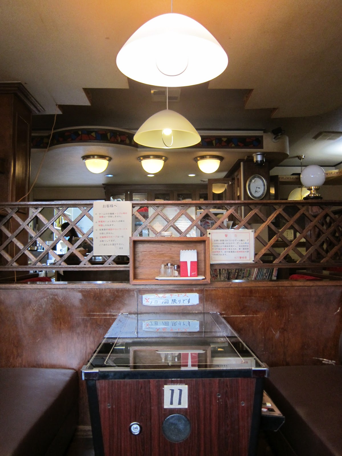 結果,中途,二人實在忍受不了,跑進了一家門外寫著是喫茶店的店家,一定要坐上一會休息一會!但甫打開門,呆住了,是很老式的西化裝修,很像是三谷幸喜劇本中的那些西餐廳的感覺……只是,這卡位中間的桌子,都裝了遊戲機! (還是我中小學年代在玩的那一種)