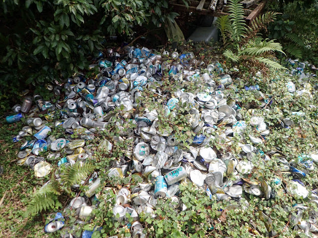 正當我們以為大功告成的時候,卻被告知山外有山,士多屋後原來另有一堆鋁罐山,而且年代更久遠,罐身已被陽光曬得通體發白,雜草叢生,有種快將與大自然融為一體的味道。