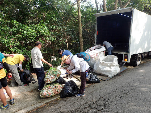 多得郊遊人士的貢獻,清潔大隊的工作毋需要等到抵達嶂上後才開始,有經驗的朋友打開網袋,戴上勞工手套,再拿出燒烤鉗子,開始拾起沿路上見到的垃圾。