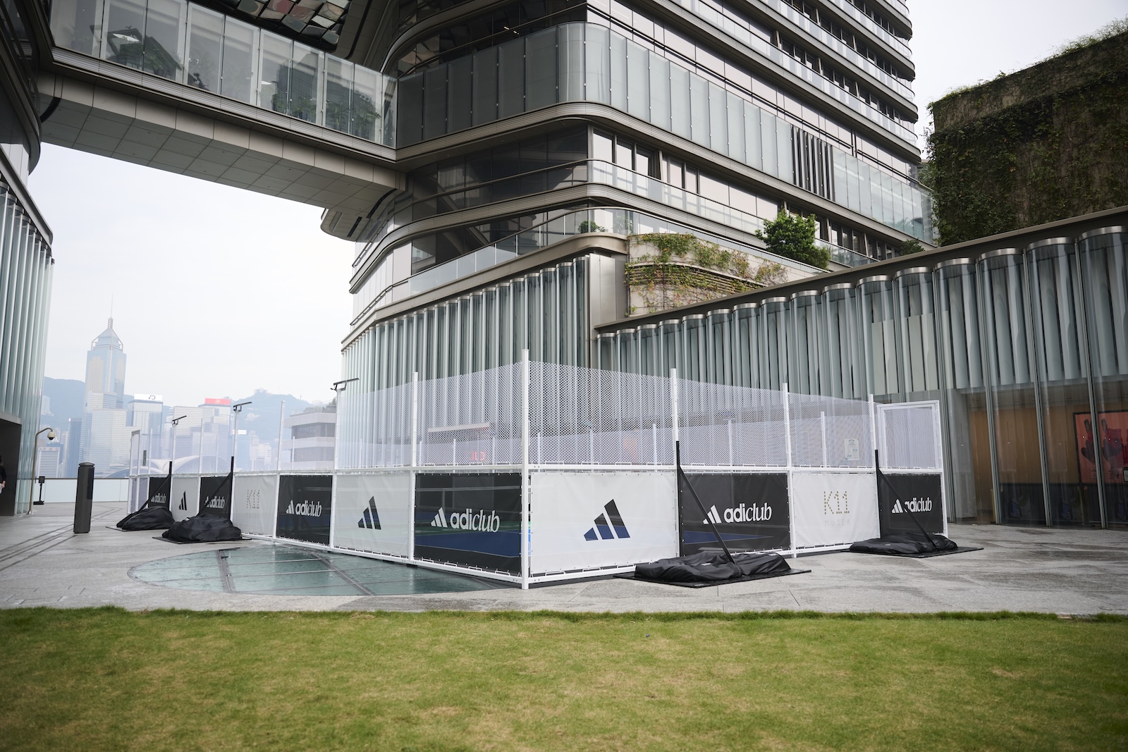 adidas在K11 MUSEA六樓雕塑公園設置匹克球場地,場地採用藍、綠、黑、白四色鋪設,配備防滑及調節球速功能的專業地面。該開放式場地可眺望維多利亞港景色。