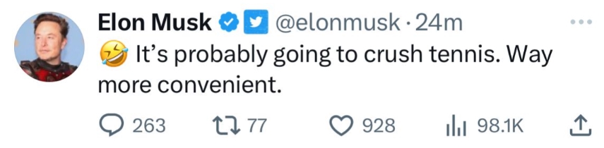 Tesla CEO Elon Musk 本人對匹克球的熱愛也早有跡可循,他早在2023年在社交媒體 X 公開表達對匹克球的看好。Elon Musk 大膽預言:「匹克球最終將碾壓網球 (Pickleball will crush tennis)。」 他認為相較於網球,匹克球更具娛樂性與普及潛力。