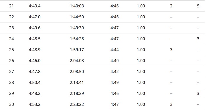 回說我在過去三個月修練的「Hansons 大法」,其中最具爭議的地方就是它的長課從不超過 26 公里,這對許多老於經驗,信奉 38 公里為馬拉松終極長課的跑手來講都是不可思議的。但 Hansons Method 的宗旨可不是教人練精學懶,它沒錯是將長課與一些耐力課的強度調低了,卻又同時提高了慢跑課(又稱恢復跑)的速度。譬如以我的目標時間來說,慢跑速度便要定在 5:28 – 5:52/km 之間,平均便是 Sub-4 時間的均速了。如此一來一回,整體訓練強度雖沒多少優惠,卻大大減低了練習受傷的機會。以我個人為例,從 8 月 7 日開操至賽前,我共跑了超過一千公里,這跟我往日參與訓練班時的訓練量相若,但往日在賽前經常困擾我的膝傷卻不翼而飛。