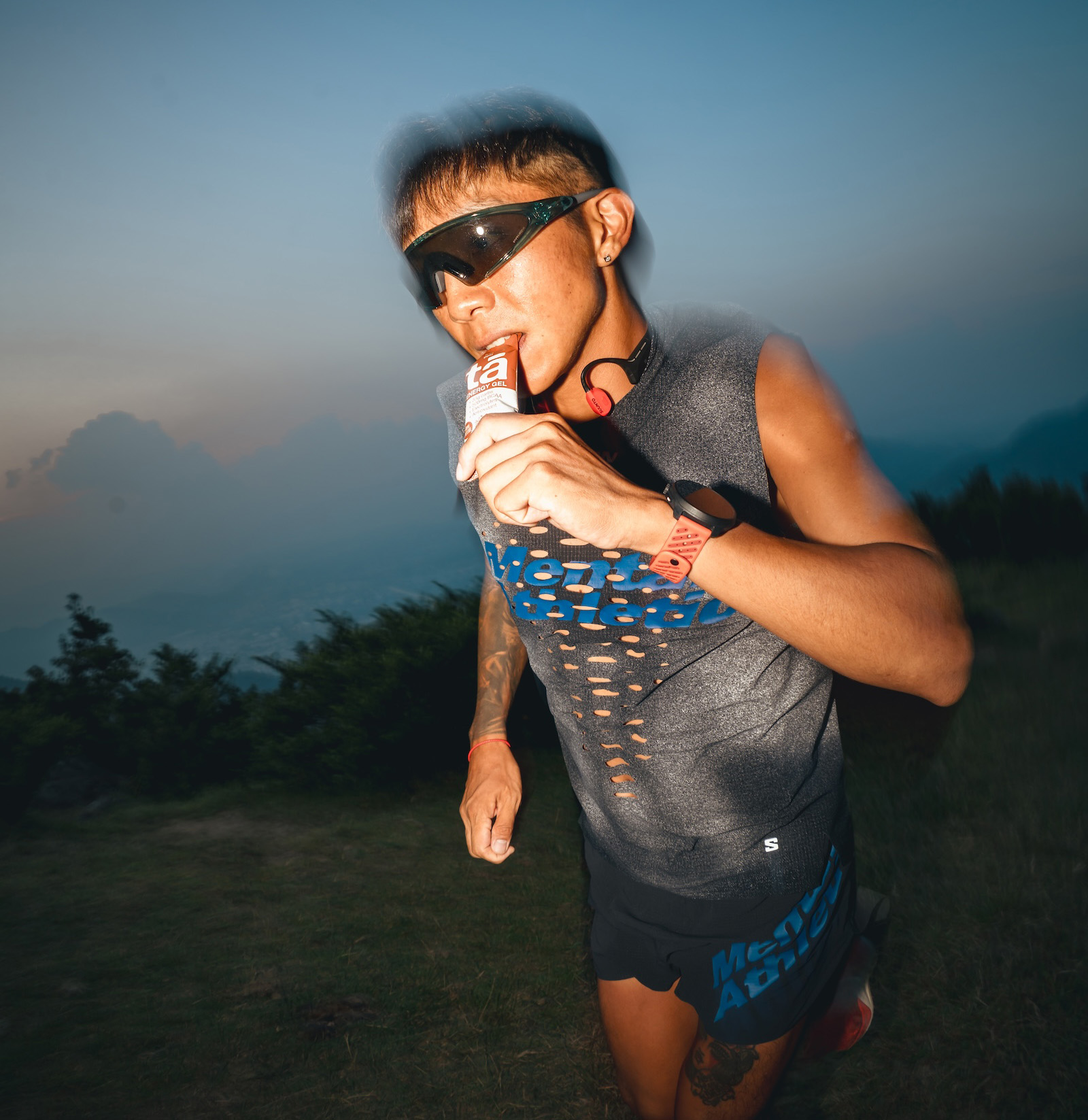 這位四徑完成者,同時在日本金澤馬拉松跑出2小時52分的跑手,無論在越野跑或路跑上,補給策略均貫徹著同一核心哲學:「腸胃必須訓練」。