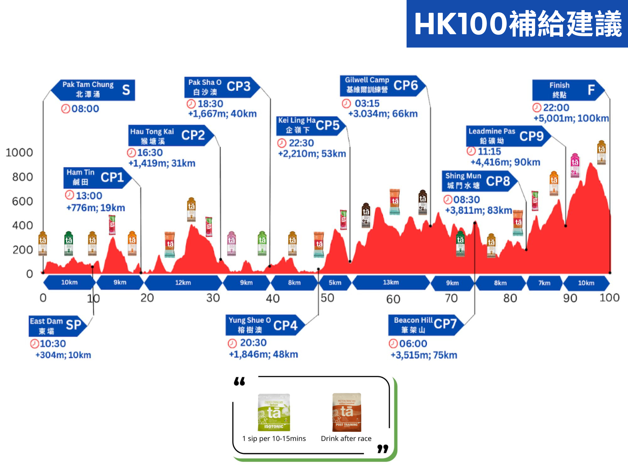 以 Hong Kong 100 為例,他計劃比賽時每30分鐘補給一次,目標是每小時攝取60g至90g碳水化合物。組合亦非常靈活,例如一小時「兩包 Gel 加一條糖 (Energy Gummies)」,或「兩包 Gel 加一條 Bar」。當然,Energy Drink 亦會由頭到尾持續飲用 (每10-15分鐘一次)。
