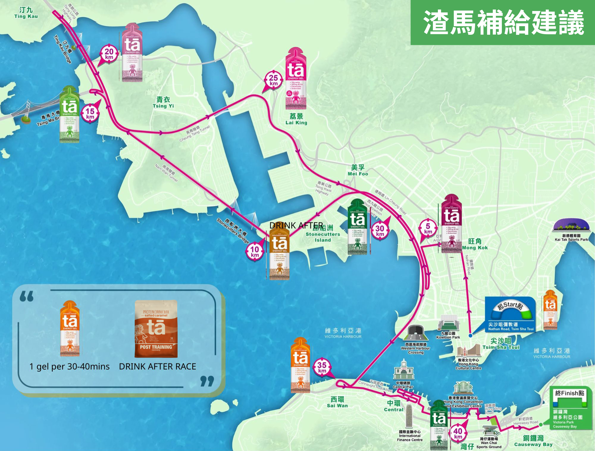 - 水站技巧: 香港馬拉松水站多達15個。跑手應在抵達水站前就準備好並食用 Energy Gel,經過水站時再飲用少量水,以助身體盡快吸收