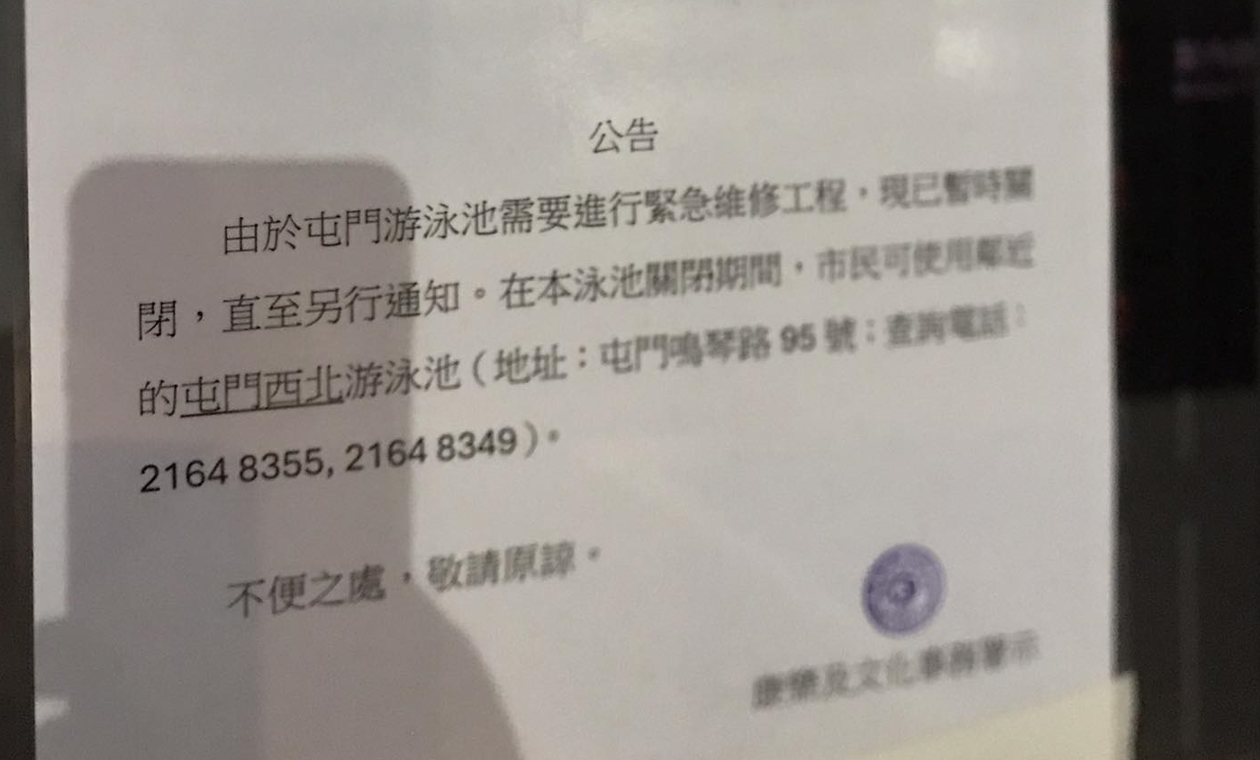 屯門新游泳池啟用僅10天驚傳「緊急維修」| 泳池關閉直至另行通告為止