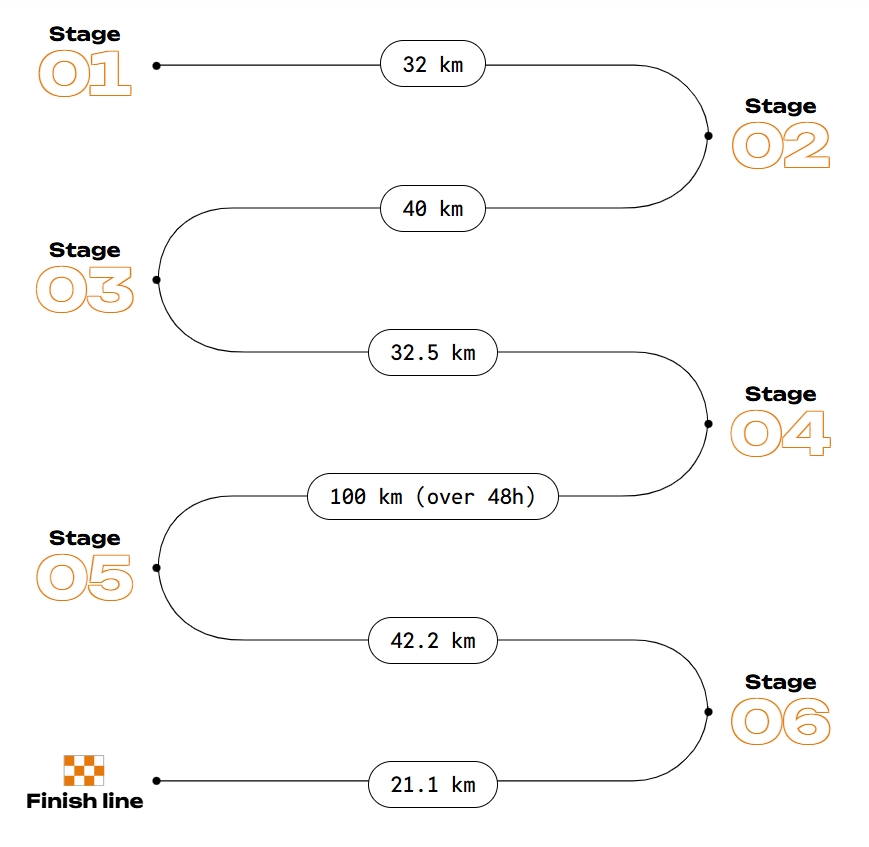 • 第四階段 (Stage 4 – The Long Stage):全賽事最具威懾力的「長途路段」,距離長達80至90公里。跑手需跨越晝夜,不少人會在星光下持續行進,限時約40小時,意志容易崩潰